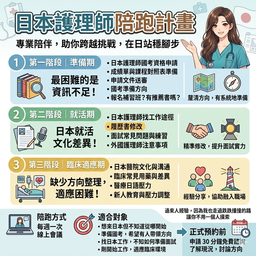 設計了這個 「日本護理師陪跑計畫」,希望能陪你一起走過這段路。